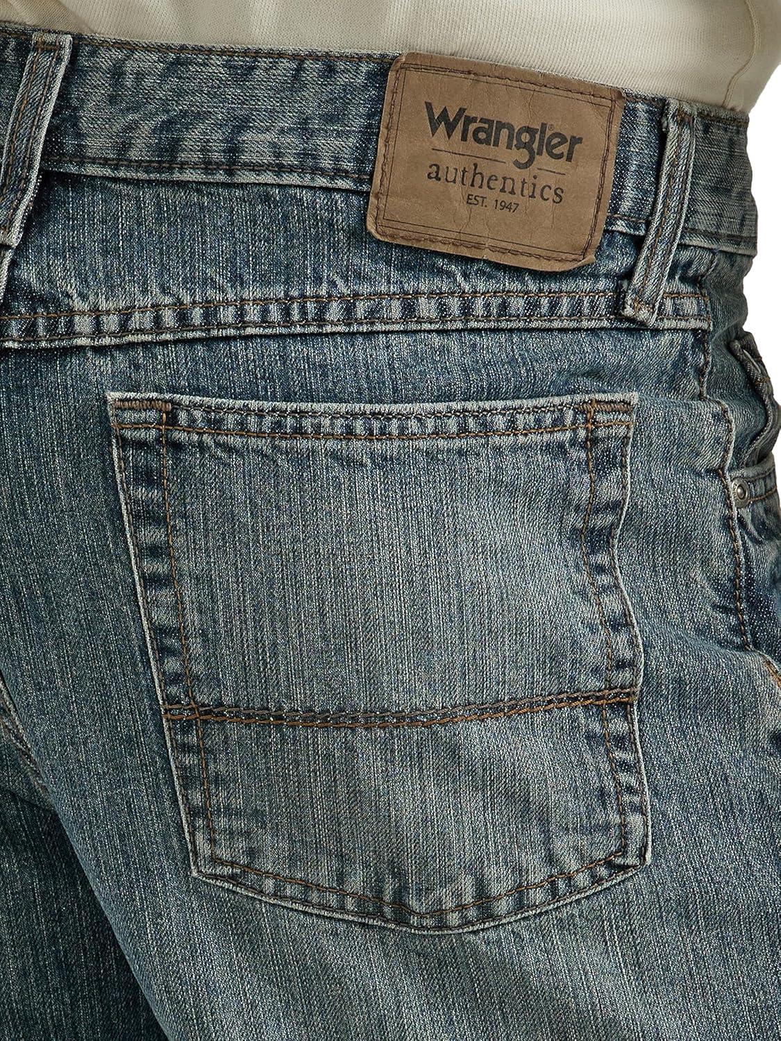 Wrangler Authentics Men's Relaxed Fit Boot Cut Jean. This denim boot cut jean is constructed with durable 100% cotton built for long-lasting wear and all-day comfort. Designed with a relaxed boot cut fit through the leg, this comfortable jean sits at the natural waist and features a relaxed seat and thigh.