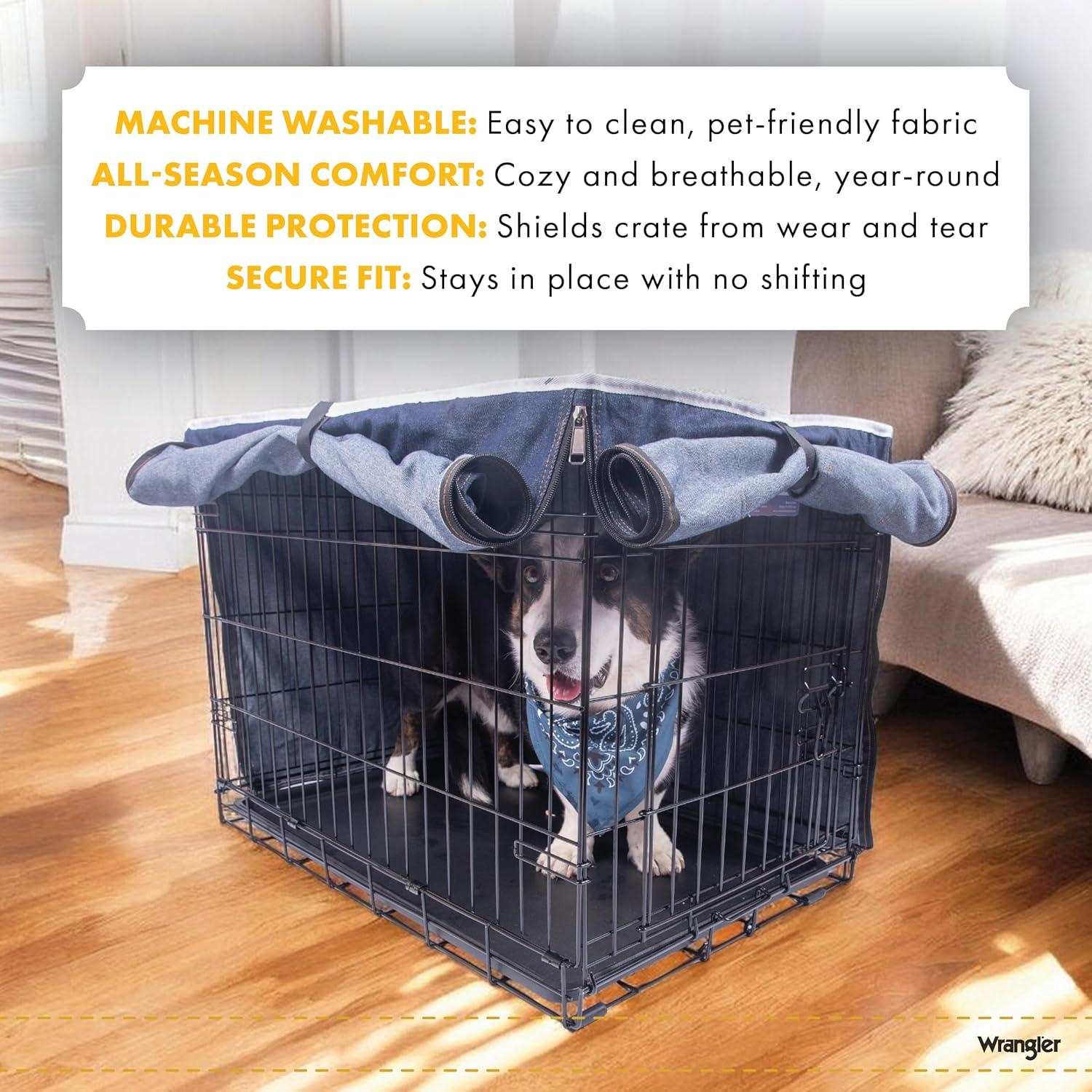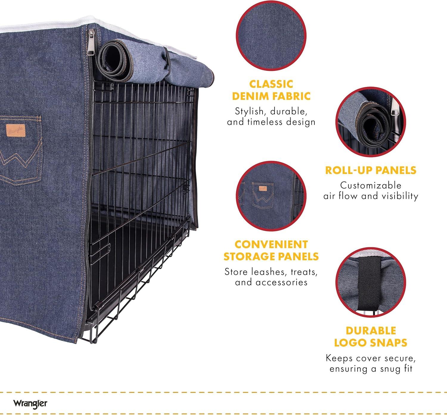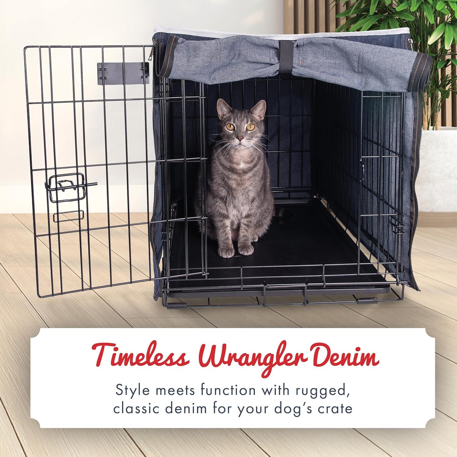 Wrangler Denim Dog Crate Cover – Durable, Breathable & Stylish Dog Kennel Cover with Rollable Panels & Front Pocket for Accesories – Machine Washable Crate Covers for Dog Cages (M)(XL)