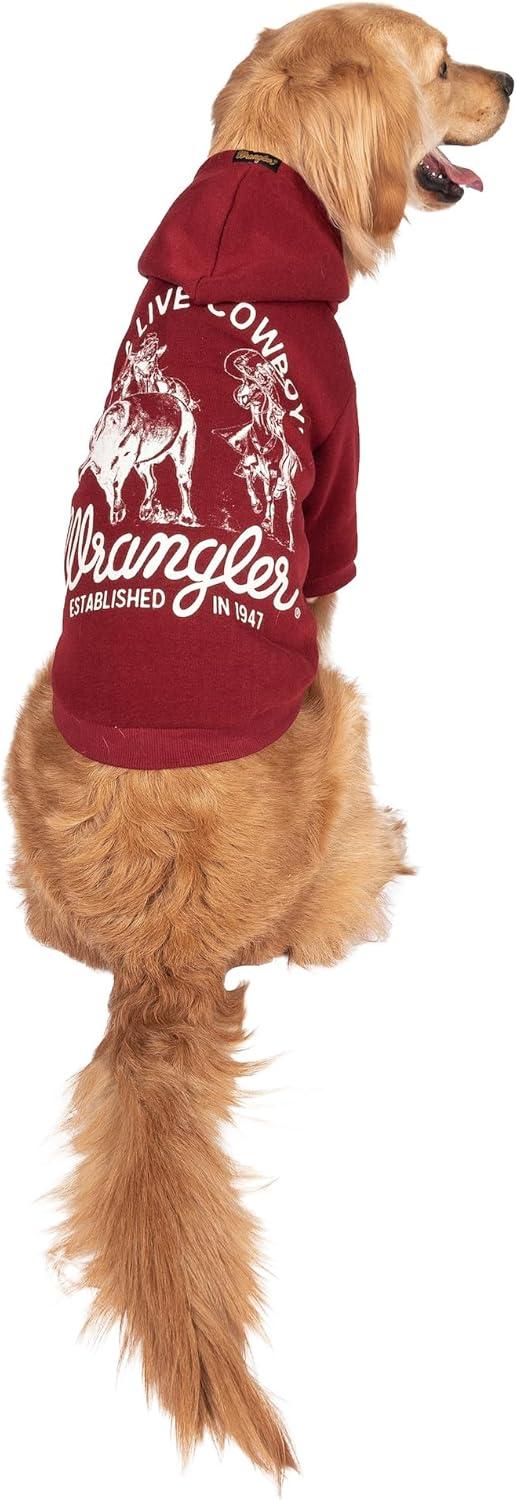 Wrangler PetLong Live CowboysBurgundy Dog HoodieMachine Washable100% PolyesterLPAP00606Wrangler Long Live Cowboys Burgundy Dog Hoodie. Includes an opening near neck for easy lead attachment. Machine washable, 100% polyester. LPAP00606