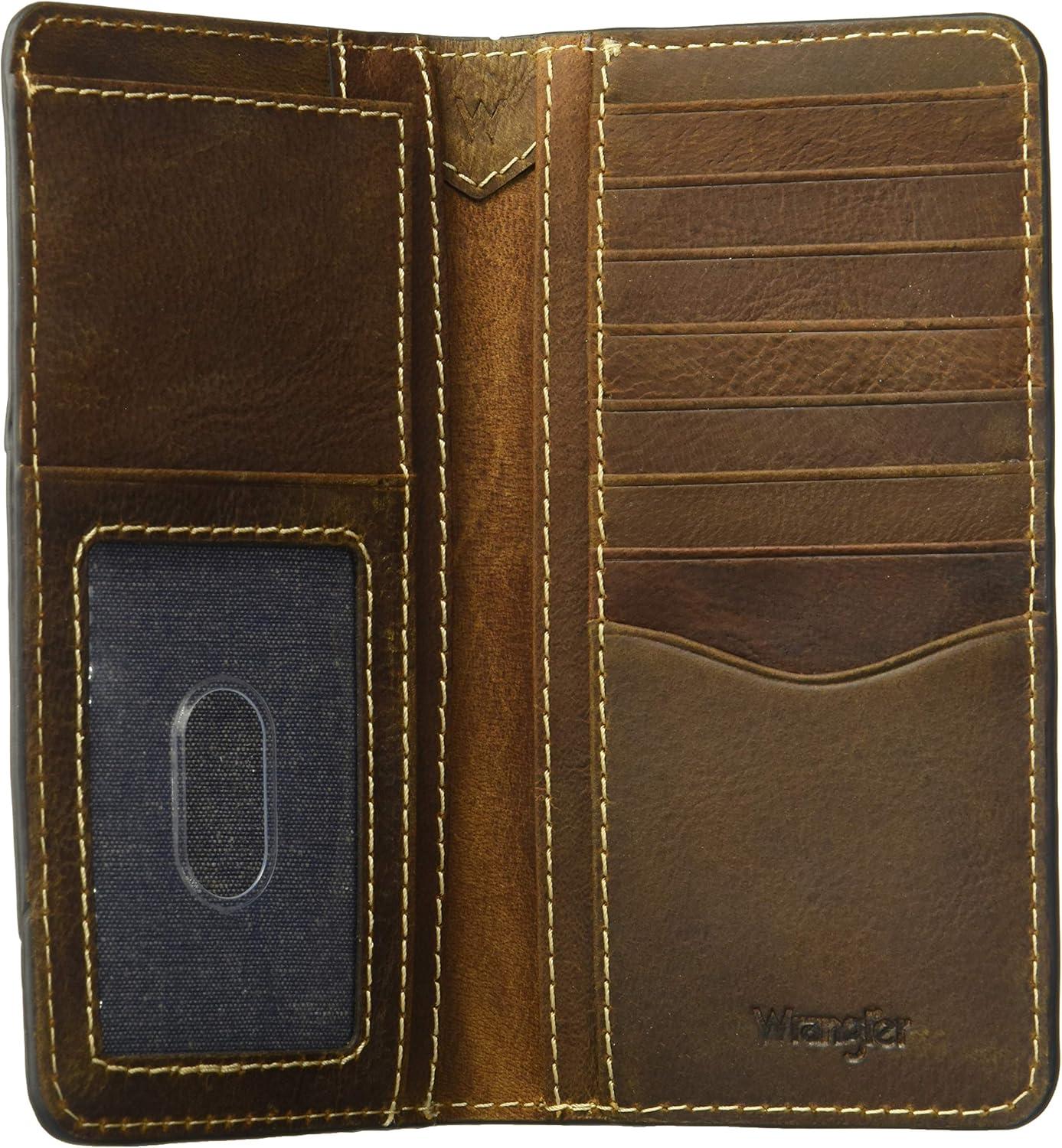 The boot stitched rodeo wallet features leather construction with 8 credit card slots, id window, 3 slip pockets, 1 Bill compartment & embossed Wrangler logo.
