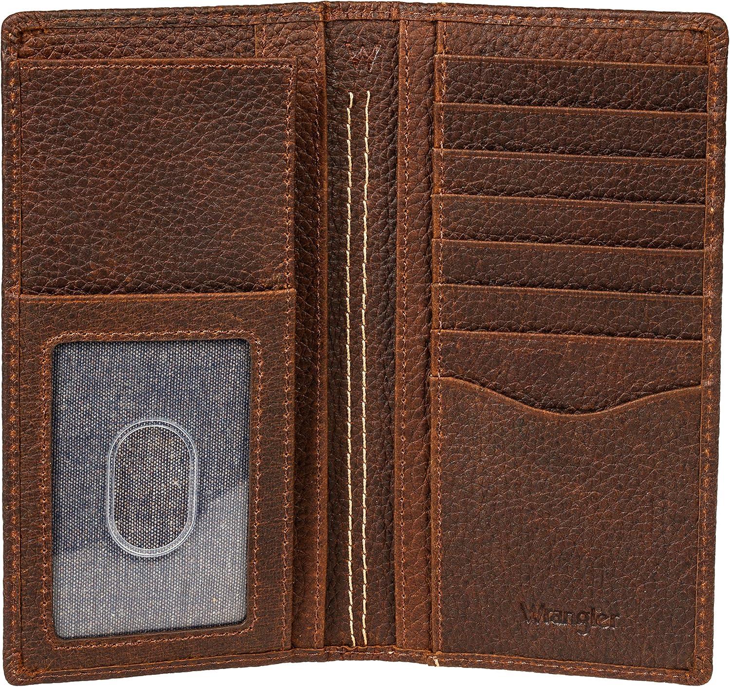 The boot stitched rodeo wallet features leather construction with 8 credit card slots, id window, 3 slip pockets, 1 Bill compartment & embossed Wrangler logo.