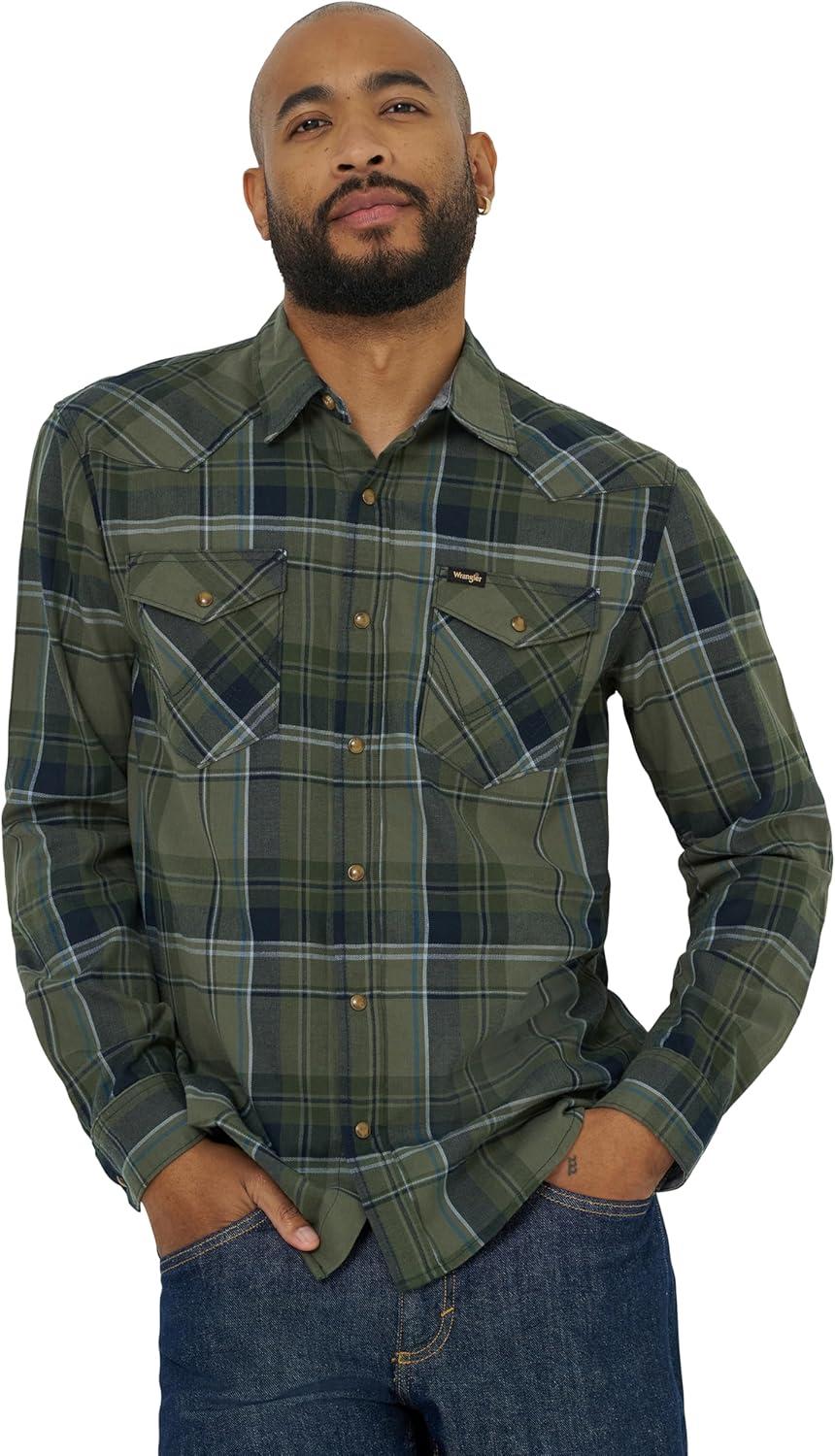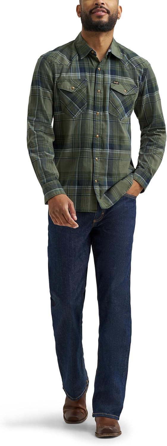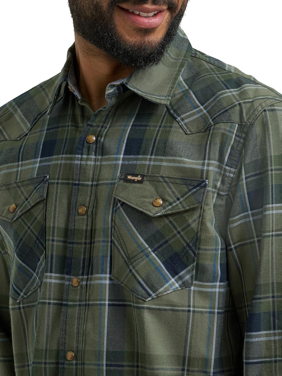 Wrangler Mens Iconic Denim Regular Fit Snap Shirt(Thyme Plaid)
