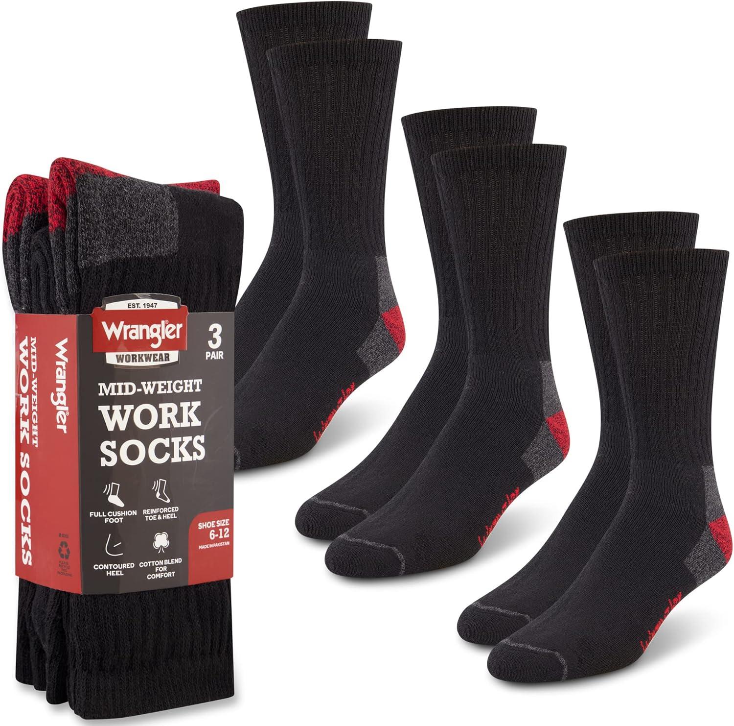 Wrangler Men’s Midweight Outdoor Work Socks, Cushioned, Arch Support, Size 6-12, Recycled Cotton, 3-Pack(Black (/Red/Grey))