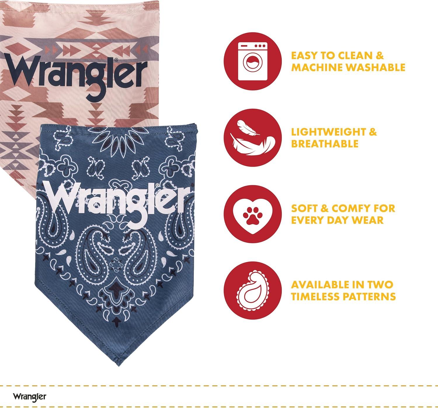 Iconic Pattern Design – Featuring timeless Wrangler designs in paisley and southwest patterns, our stylish dog bandana enhances your pet’s look for any occasion, blending classic flair with authentic brand style