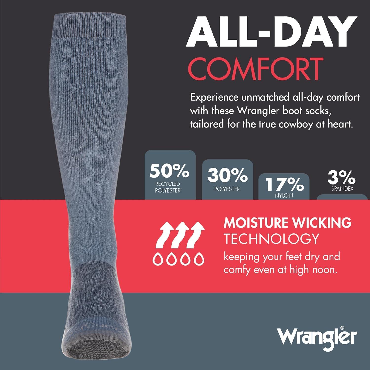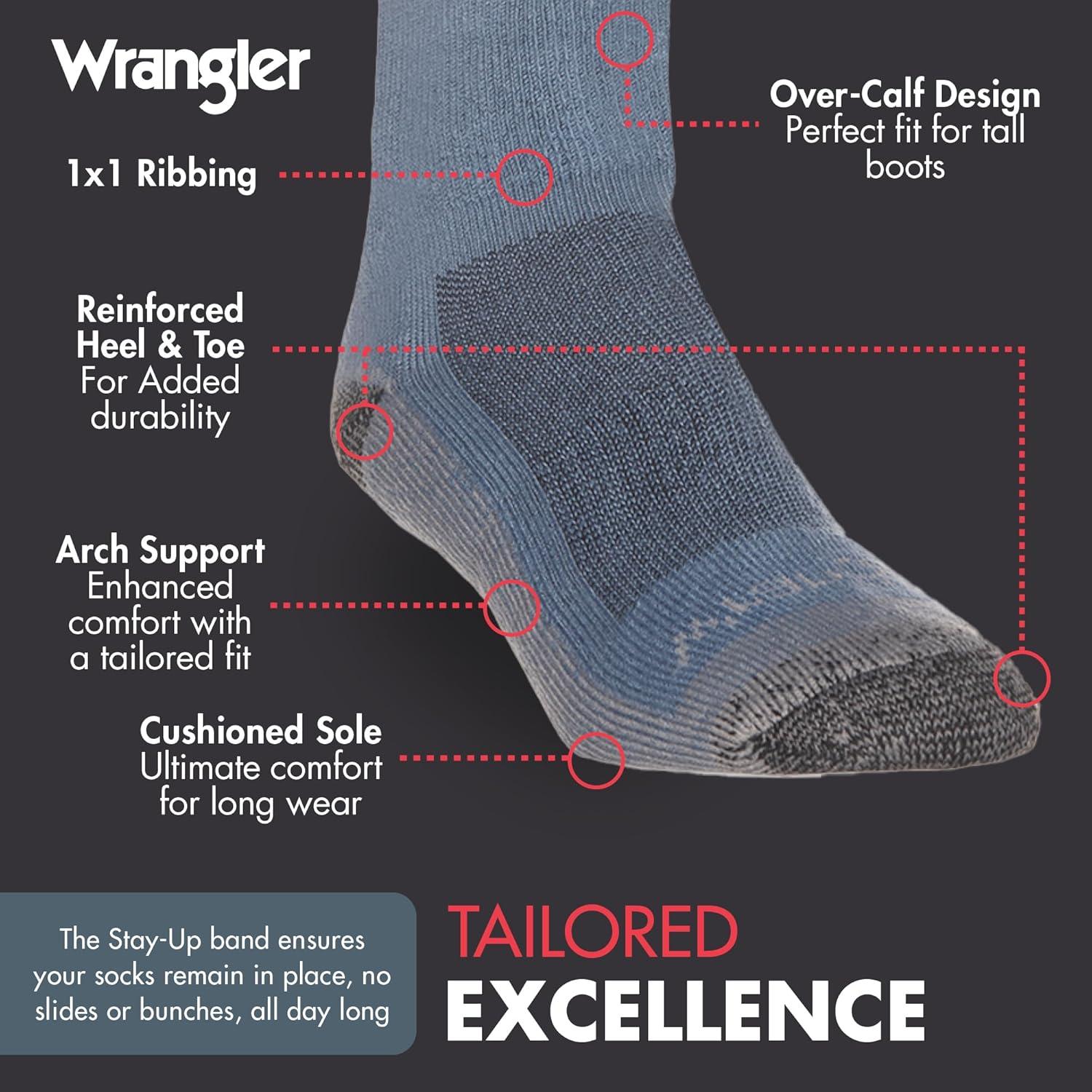 Wrangler Ryder Western Cowboy Boot Socks for Men – Over Calf, Cushioned Sole, Moisture-Wicking, Durable Design(Blue)