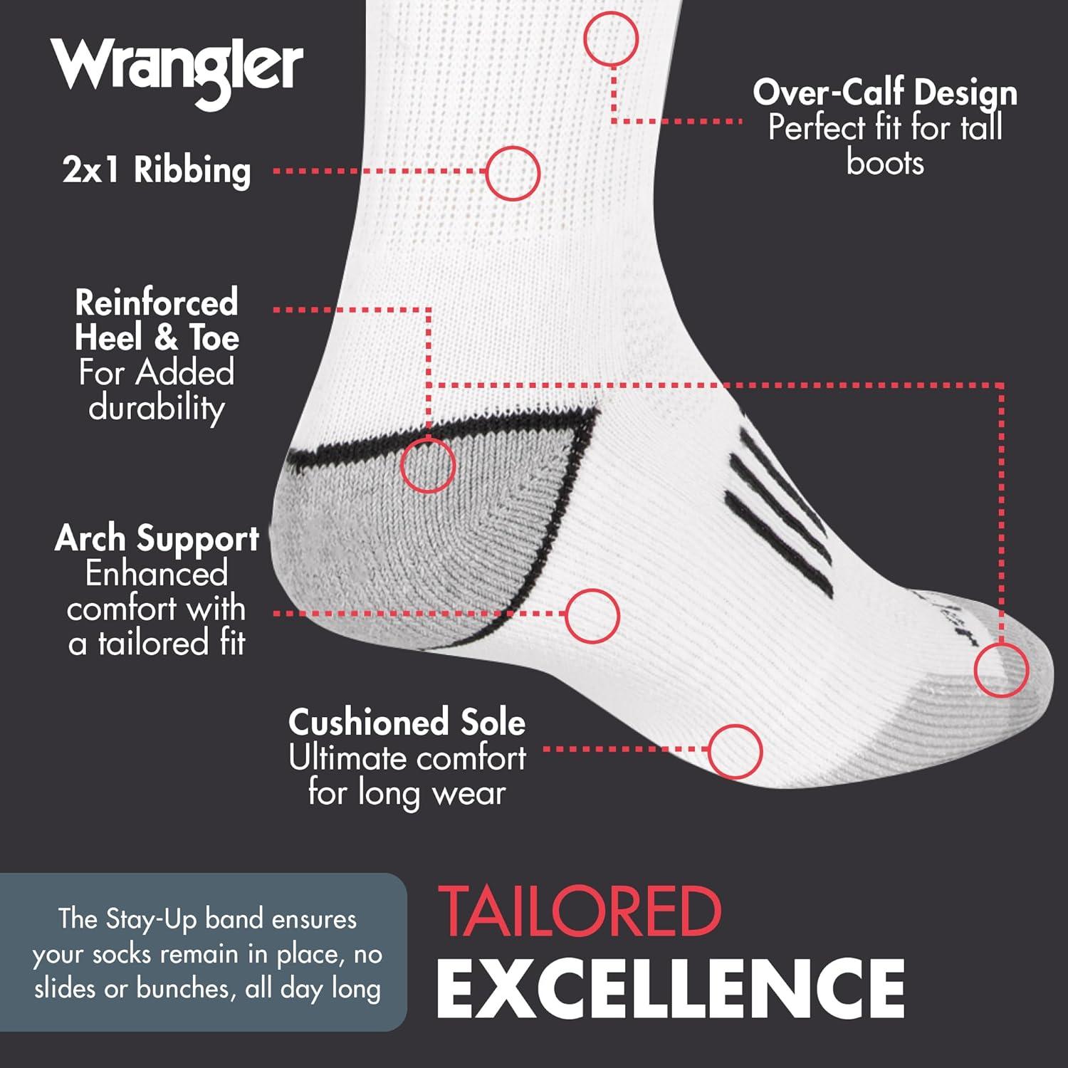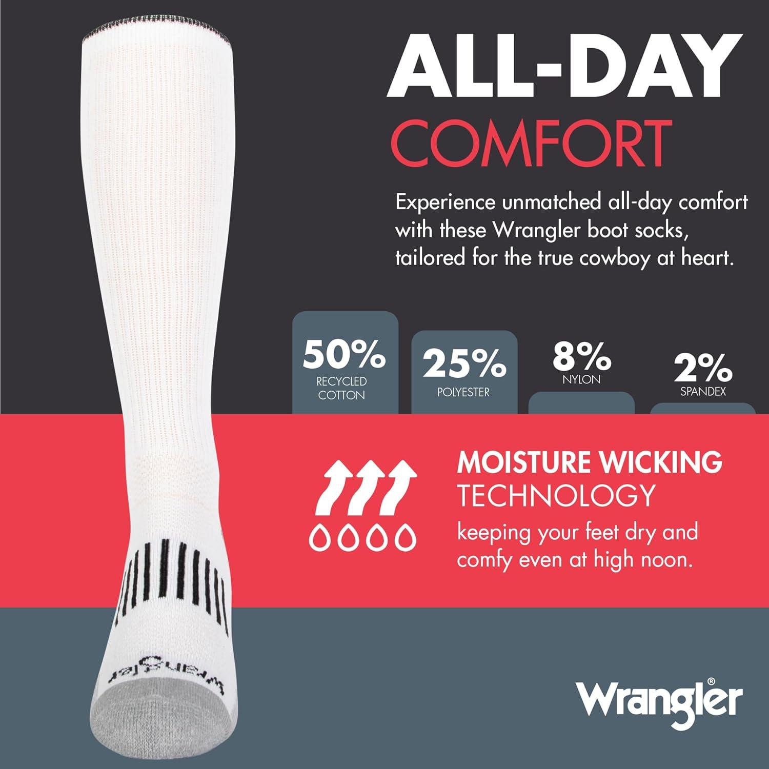 Wrangler Ryder Western Cowboy Boot Socks for Men – Over Calf, Cushioned Sole, Moisture-Wicking, Durable Design(White)