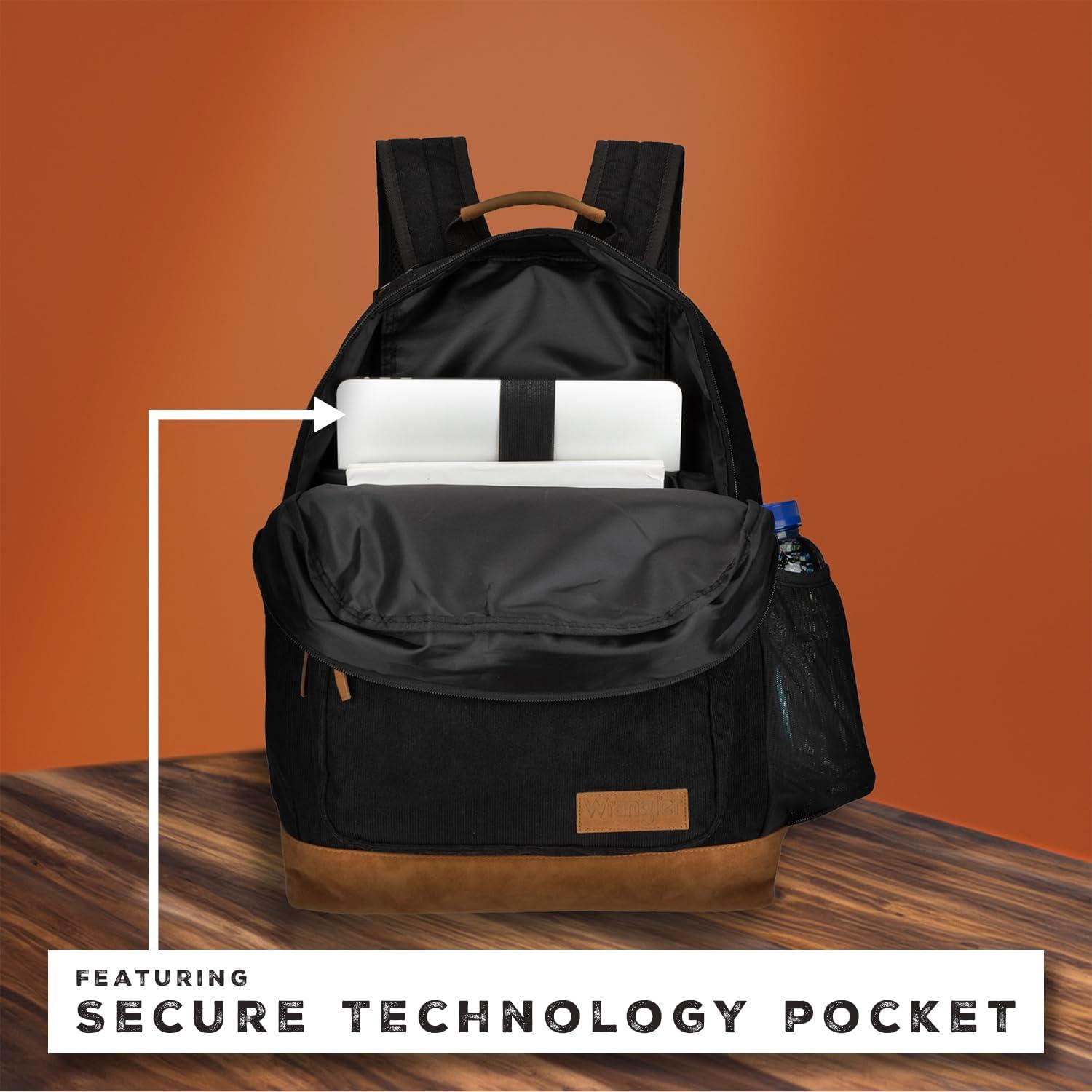CLASSIC DESIGN: Wrangler Yellowstone backpack is built for practical use while offering modern style. Equipped with carefully designed interior and exterior pockets, this convenient and comfortable pack keeps your laptop and supplies secure.